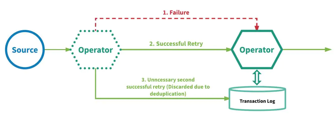 At Least Once+ 消息去重重放失败事件,尝试重复处理,在每个算子上,在事件进入到用户定义的逻辑之前删除重复事件。该机制要为每个算子维护一份事务日志(