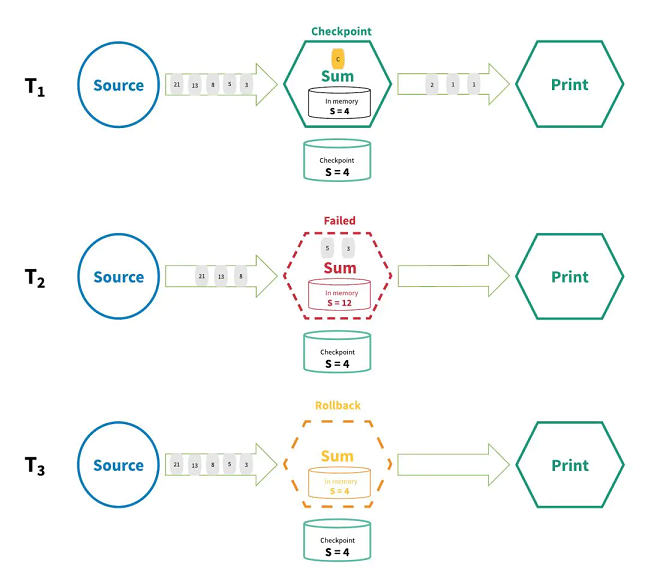 T1时,流处理应用在正常工作,同时状态也被checkpointed。T2时,算子处理输入数据失败了,这时S = 4的状态已经持久化保存到存储中,S = 12的状态仍位于算子内存中,出现了不一致。T3时,processing graph倒回到S = 4的状态并重放流中的每个状态直到最新状态,处理每个数据,解决了这个不一致问题。- 最终虽然某些数据被处理了多次,但无论回滚多少次,结果状态依然相同。