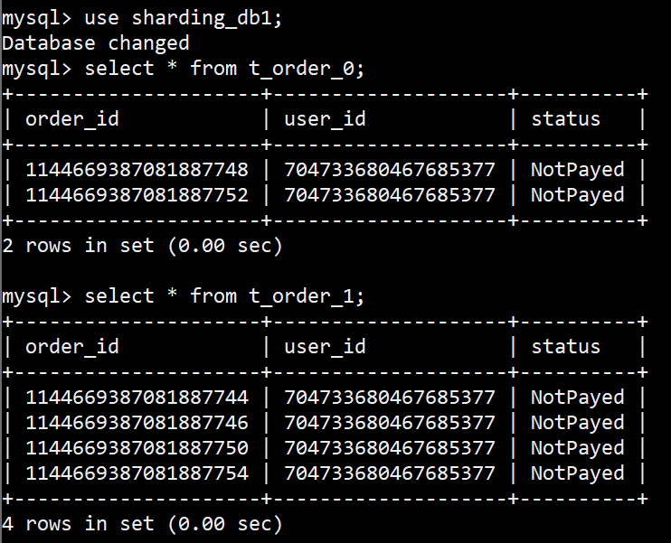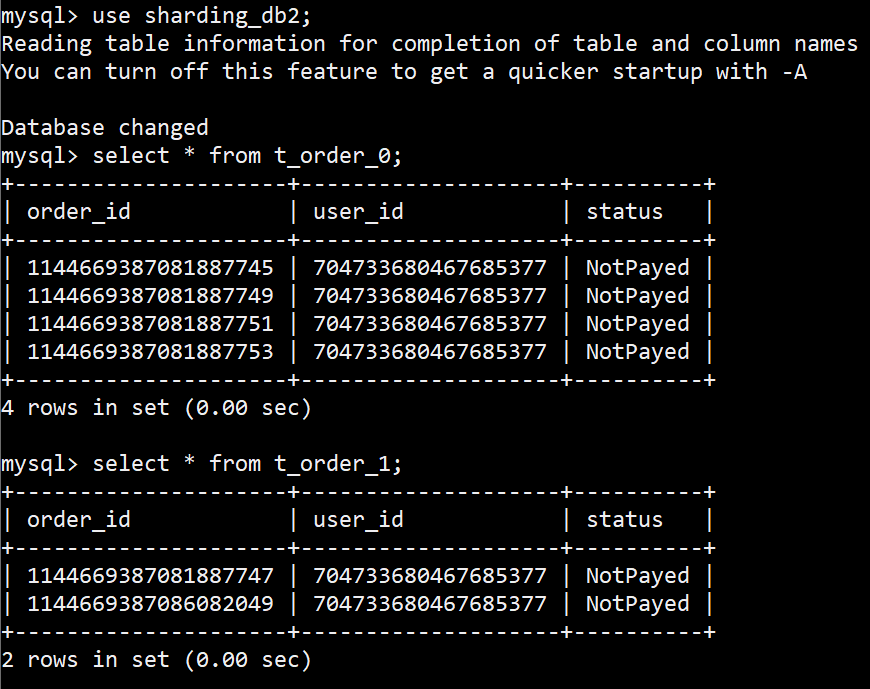 [main] INFO ShardingSphere-SQL - Actual SQL: ds0 ::: select order_id, status, user_id from t_order_0 where order_id=? ::: [1144669387081887749]