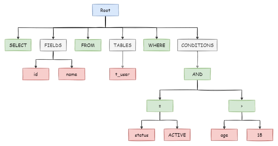 参考shardingsphere官方文档,sql语句会解析出一棵树,绿色是sql关键字,红色是sql中的变量,灰色是抽象的概念节点。