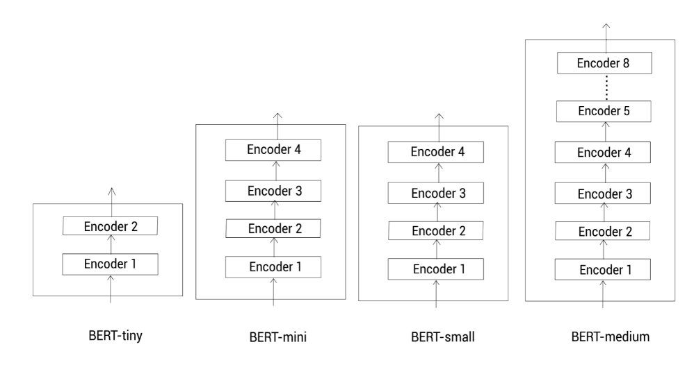 为了在计算资源有限的情况下使用BERT,研究者们提出了几种更小的模型配置,分别是BERT-tiny、BERT-mini、BERT-small、BERT-medium。这些模型在参数量和计算复杂度上进行了简化,但仍然保留了BERT的核心特性。