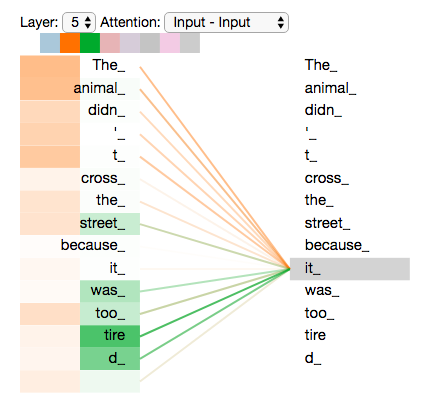 现在我们已经谈到了注意力头,让我们重新审视之前的例子,看看在我们的例句中编码单词it时,不同的注意力头都集中在哪里: