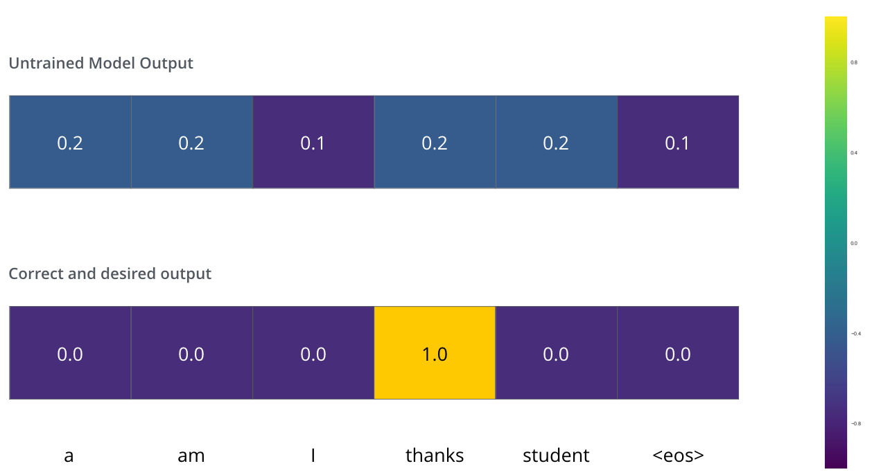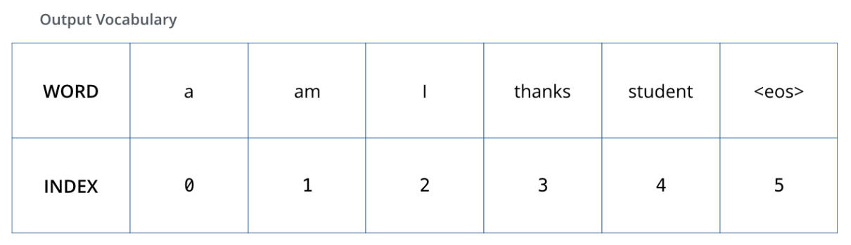 为了直观地展示这一点,假设输出词汇表只包含六个单词(a、am、i、谢谢、学生和<eos>(句末的缩写)),模型的输出词汇表是在我们开始训练之前的预处理阶段创建的。